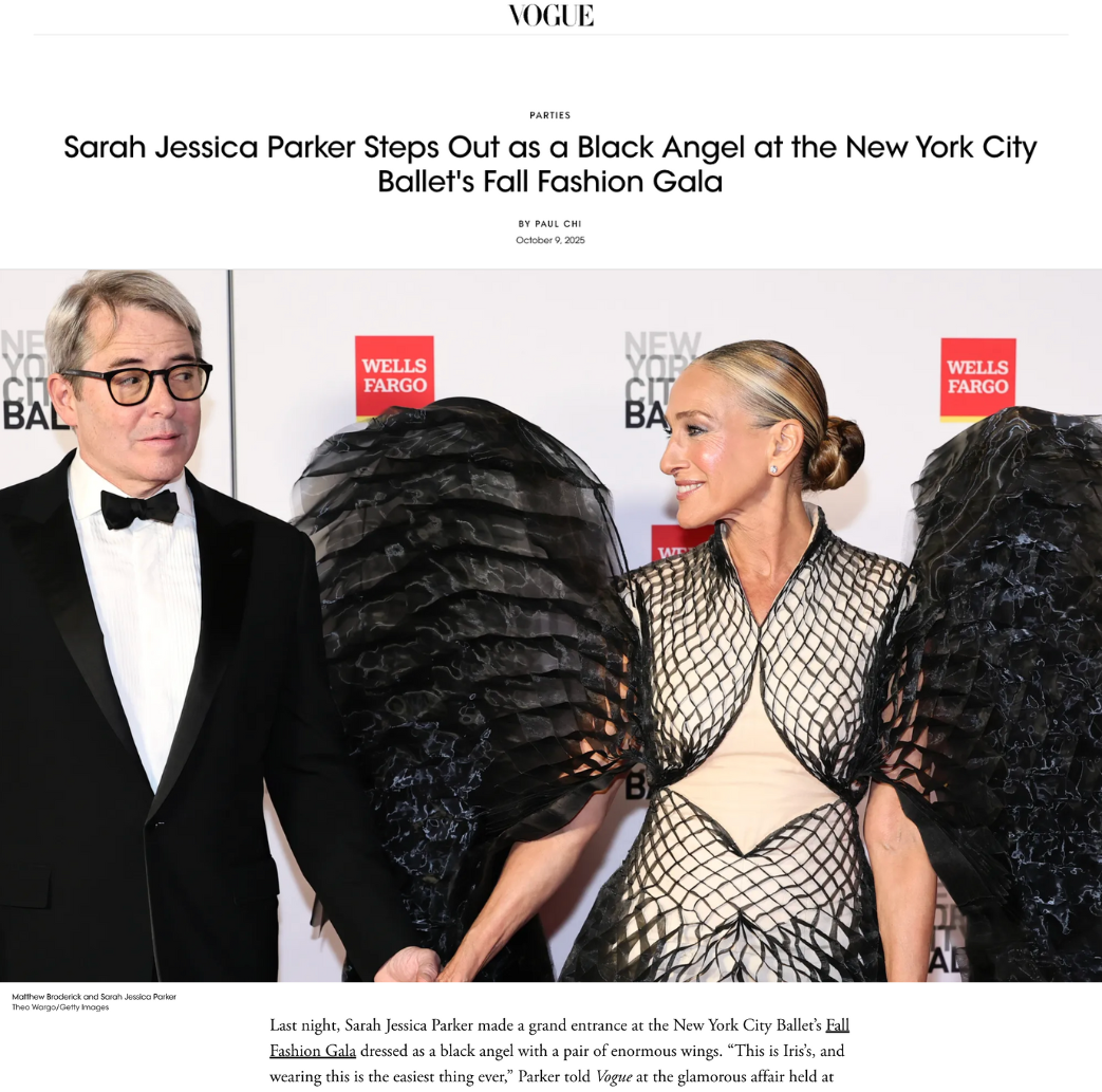 Last night, Sarah Jessica Parker made a grand entrance at the New York City Ballet’s Fall Fashion Gala dressed as a black angel with a pair of enormous wings. “This is Iris’s, and wearing this is the easiest thing ever,” Parker told Vogue at the glamorous affair held at Lincoln Center. “These wings weigh nothing. It’s so comfortable to wear.”